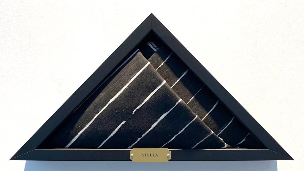 Greenbergian Soldier: Frank Stella, 2023, acrylic on canvas, 17.5 x 12.5 x 3.5″